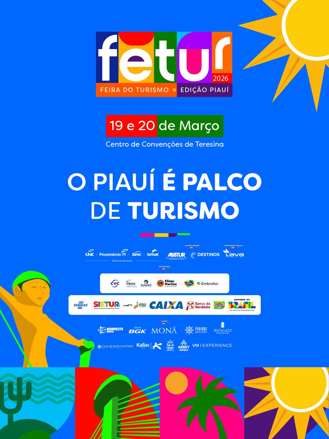 A Fetur é considerada a maior vitrine do potencial turístico do Piauí e, em 2026, acontece nos dias 19 e 20 de março, no Centro de Convenções de Teresina. O evento reúne destinos, experiências e oportunidades de negócios, fortalecendo o turismo e a economia do estado. A feira é realizada pelo Sistema Comércio CNC, Fecomércio, Sesc e Senac, com co-realização da ABBTUR e Destinos, com a produtora oficial Leve Corporativo, patrocínio CVC, FBHA, Espero, Elizeu Martins, Brasil Embratur, Sebrae, Sietur, Secretaria de Turismo, Governo do Piauí, Caixa, Banco do Nordeste, Tem Patrocínio, Tem Governo do Brasil, Governo do Brasil.
