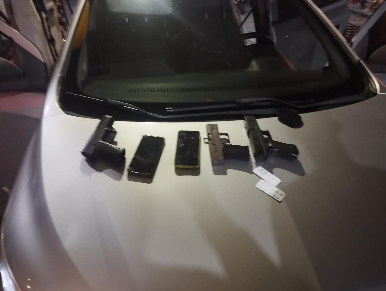 Na vistoria, os policiais apreenderam dois simulacros de pistola, uma arma artesanal, quatro celulares e dois cordões de prata, que, conforme a PM, haviam sido roubados de outras vítimas pouco antes.