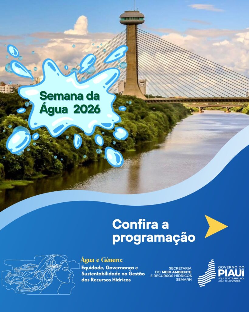 A Secretaria do Meio Ambiente e Recursos Hídricos do Piauí (Semarh) realiza, de 23 a 27 de março, a Semana da Água 2026, em alusão ao Dia Mundial da Água, celebrado no dia 22. Neste ano, o evento traz como tema “Água e gênero: equidade, governança e sustentabilidade na gestão dos recursos hídricos”.